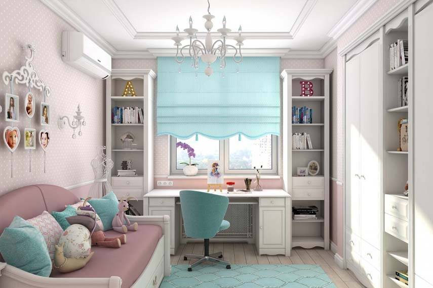 - Если рабочее место будет у окна, не используйте длинные шторы. Лучшим вариантом для детской в зависимости от стиля интерьера будут римские, рулонные или австрийские шторы.