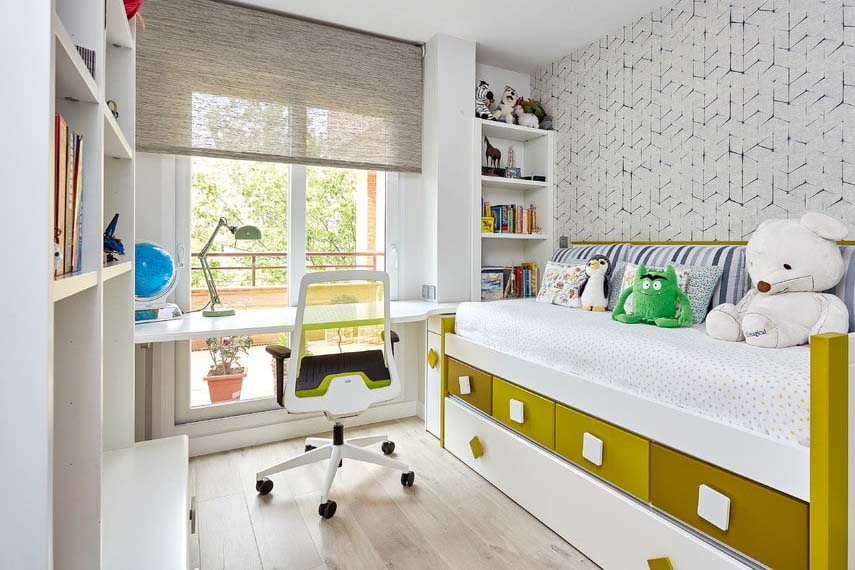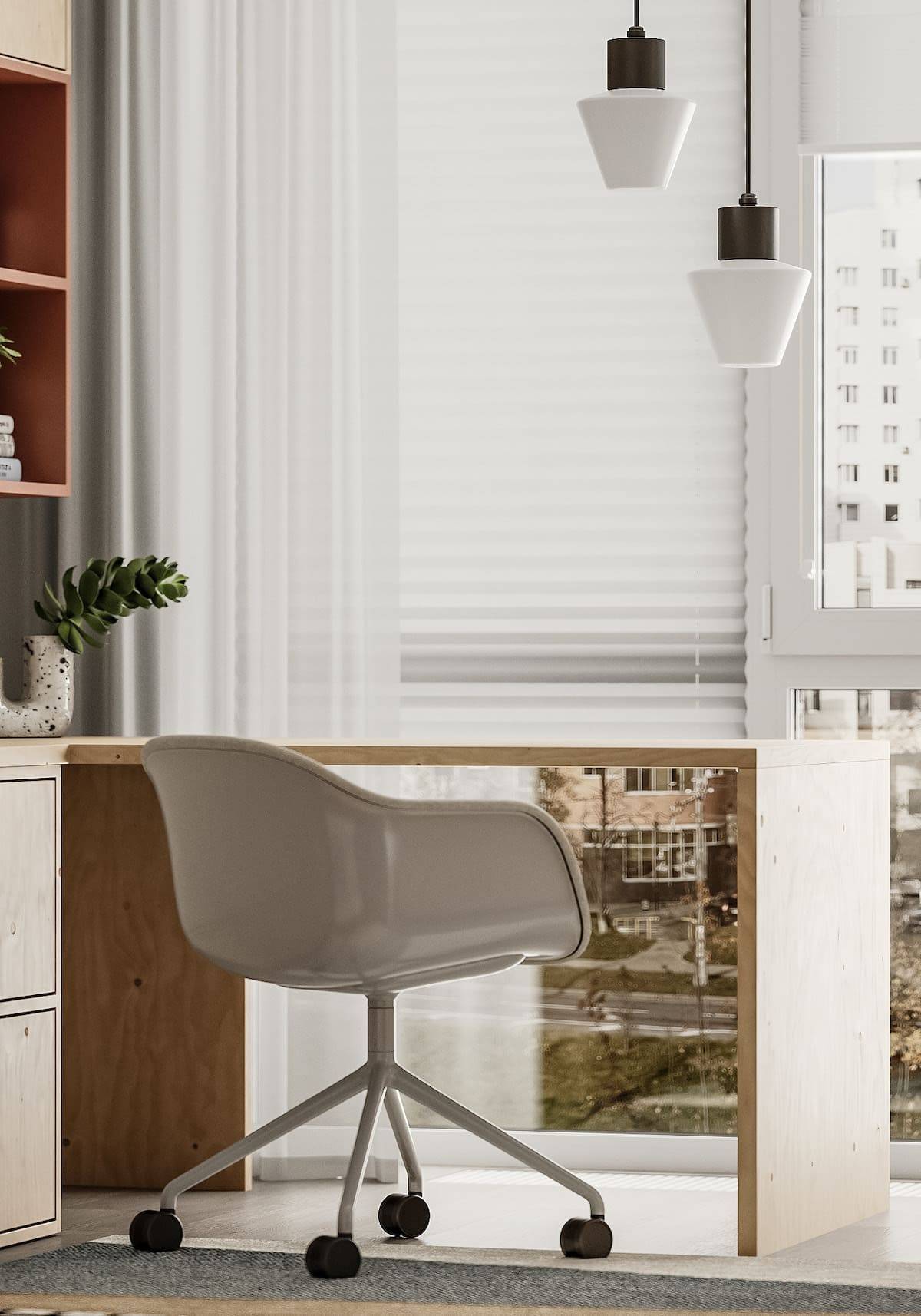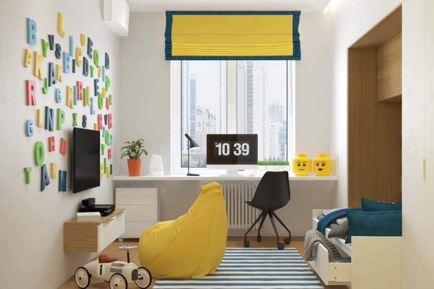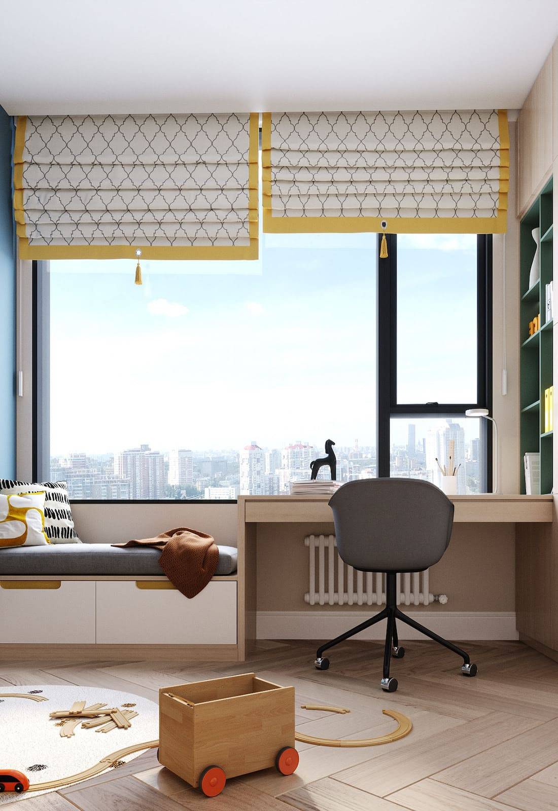 - В комнате, где стол стоит напротив оконного проема, не используйте длинные шторы. Они мешают ногам школьника. Отличным вариантом будут римские, рулонные модели.