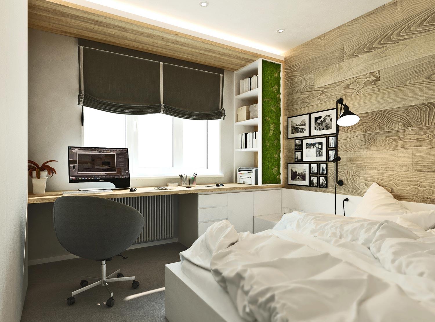 В спальне не так много места для организации рабочего места. Если использовать зону подоконника, вы сможете создать достаточно комфортные условия для работы. Удачный вариант совмещения рабочего стола и встроенных шкафов. Получается просторный купе.