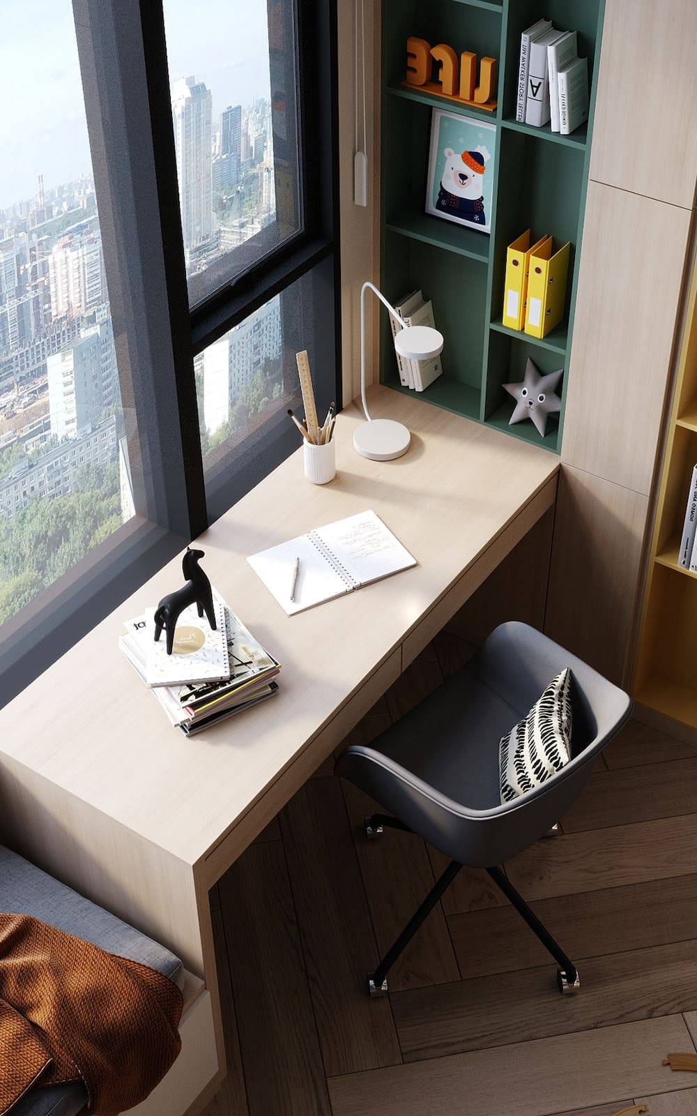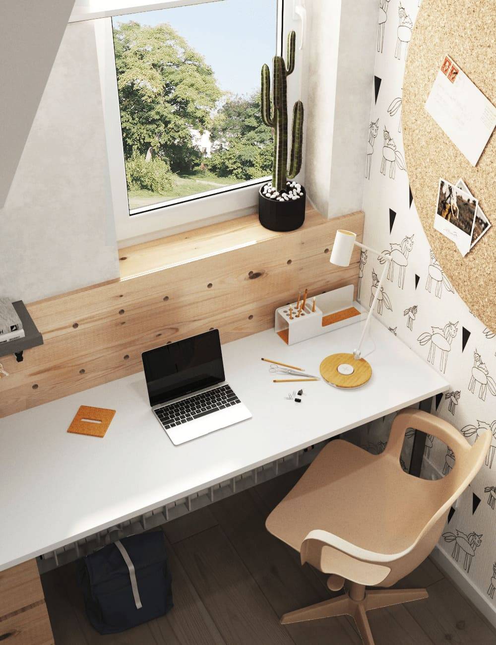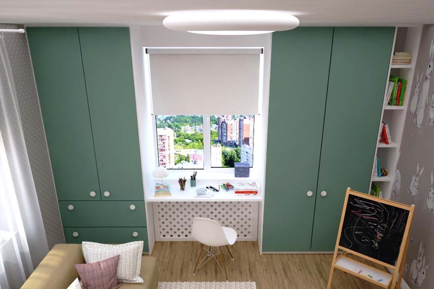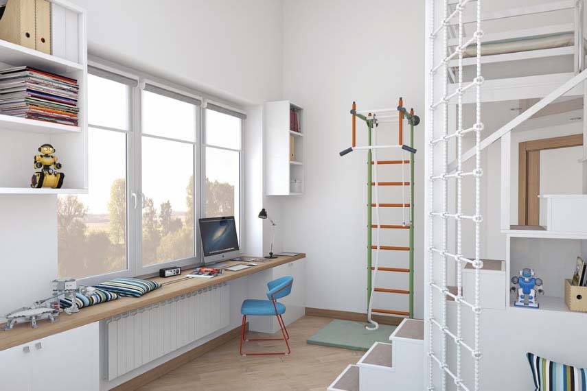Дети любят играть, а для этого требуется много свободного места. Использование пространства в области окна освободит игровую область. Если раздвинуть подоконник и вырезать столешницу под углом, можно будет легко выделить место не только для кабинета, но и для обустройства компьютерного уголка в комнате.