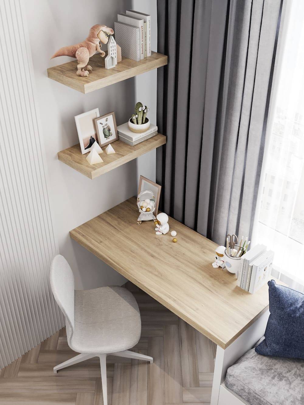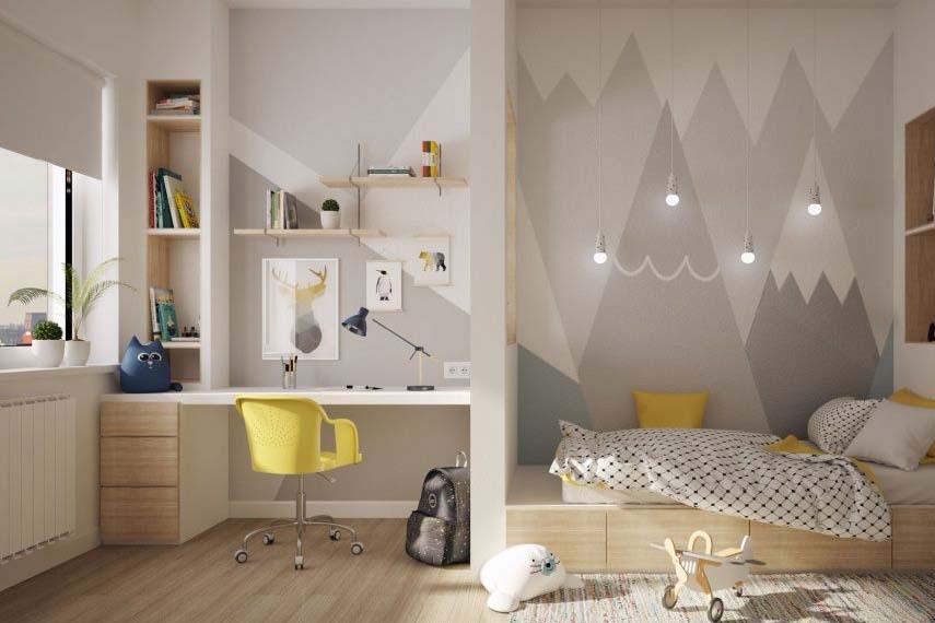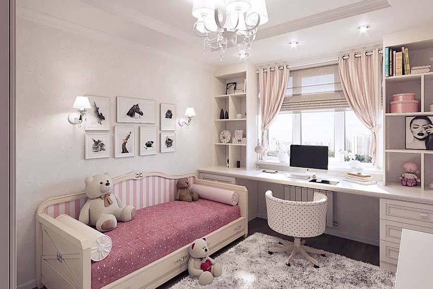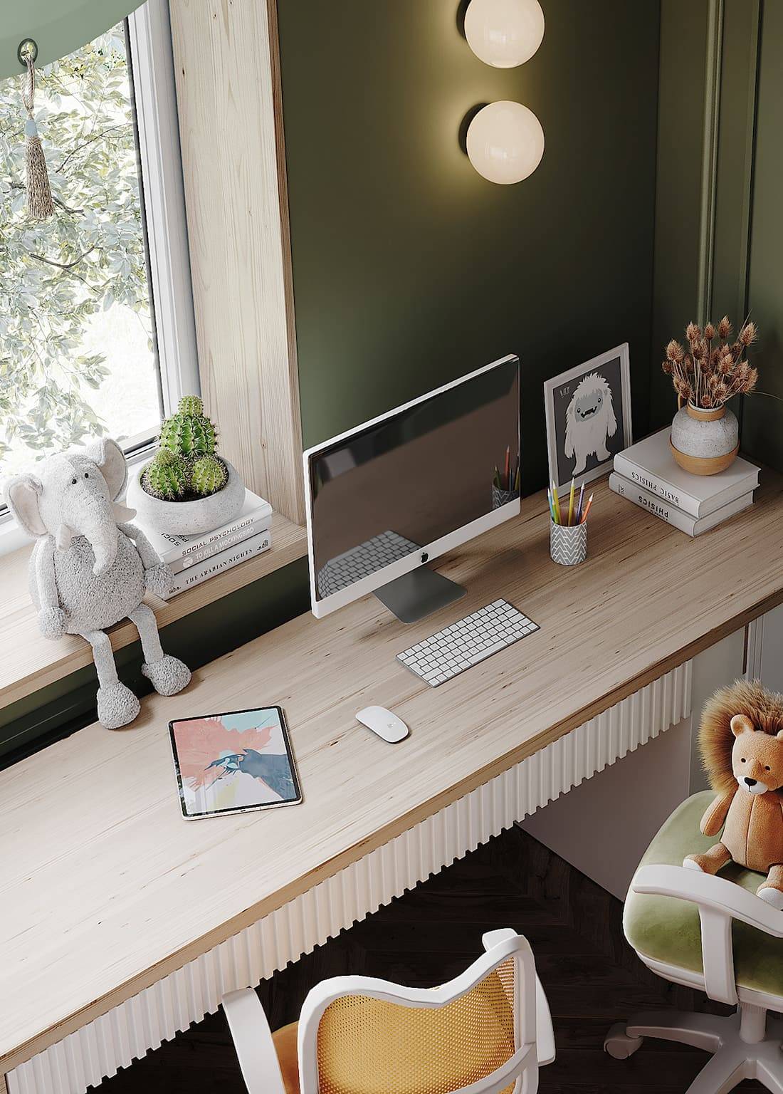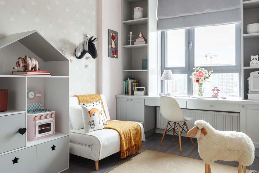 Дети любят играть, а для этого требуется много свободного места. Использование пространства в области окна освободит игровую область. Если раздвинуть подоконник и вырезать столешницу под углом, можно будет легко выделить место не только для кабинета, но и для обустройства компьютерного уголка в комнате.