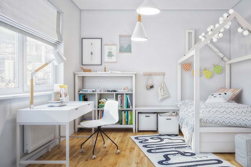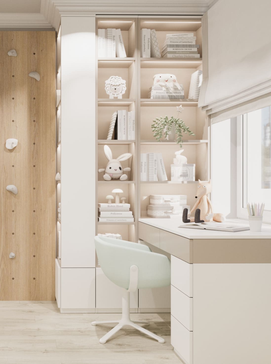 Оригинально выглядит комната в светлых тонах, например бело-зеленый. На белой столешнице разместите лампу для дополнительного освещения, коробки для мелочей и даже игрушки.