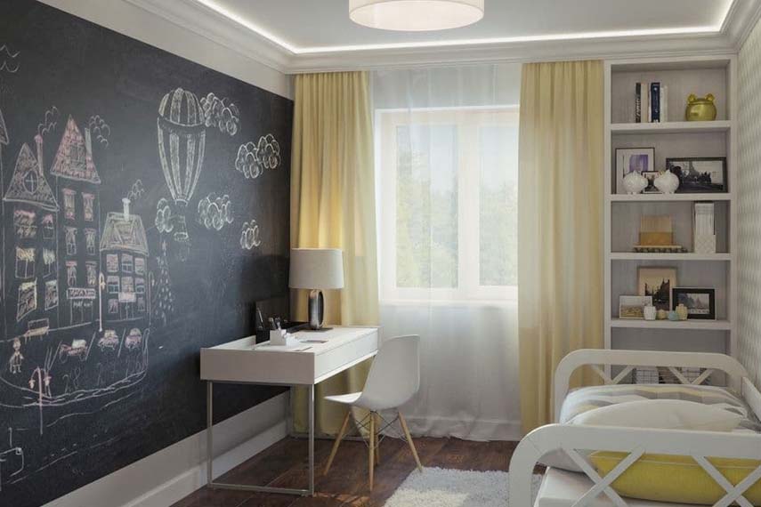 Конечно, если предполагается определенная дизайнерская задумка, можно разместить стол и в середине комнаты. При этом помните, что так вы рискуете здоровьем своего ребенка. Ведь искусственное освещение не сможет в полной мере заменить естественный свет. Соответственно зрение будет больше напрягаться.