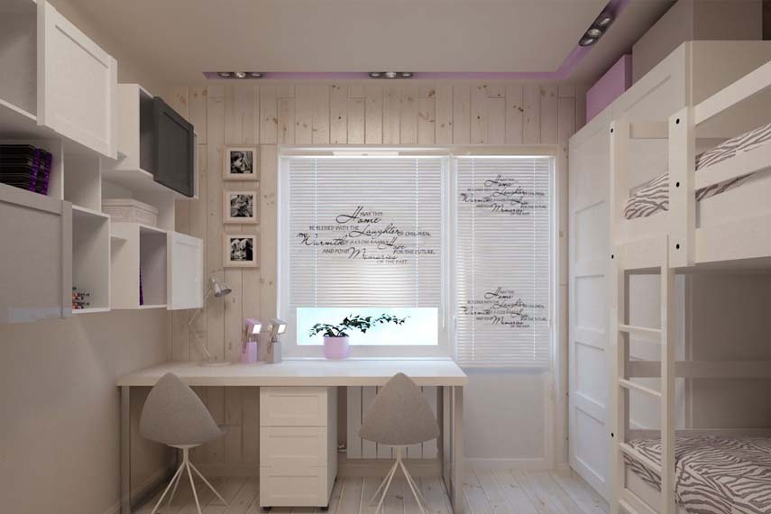 Найти в квартире свободное место для организации рабочих мест для двух школьников не так-то просто. Если использовать для этих целей сиденье на подоконнике, проблема будет решена. Стол будет достаточно длинным, чтобы за ним удобно расположились двое учеников. Свободное место у стен можно занять полками для школьных принадлежностей.