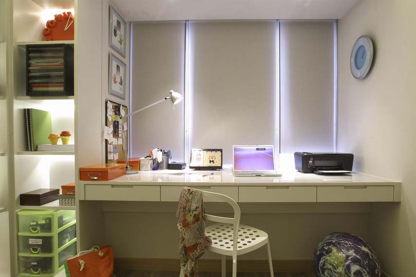 Найти в квартире свободное место для организации рабочих мест для двух школьников не так-то просто. Если использовать для этих целей сиденье на подоконнике, проблема будет решена. Стол будет достаточно длинным, чтобы за ним удобно расположились двое учеников. Свободное место у стен можно занять полками для школьных принадлежностей.