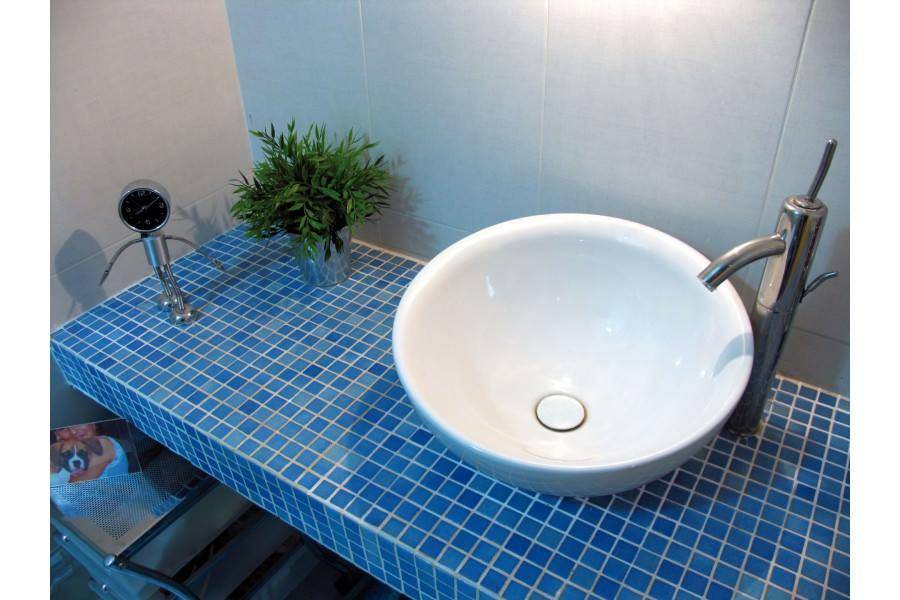 Столешницы в ванной из мозаики отличаются надежностью и оригинальным внешним видом. Из маленьких плиточек составляют картину или красивый узор. У такого изделия большой вес, поэтому требуется сделать его надежным, прочным и с устойчивым основанием.