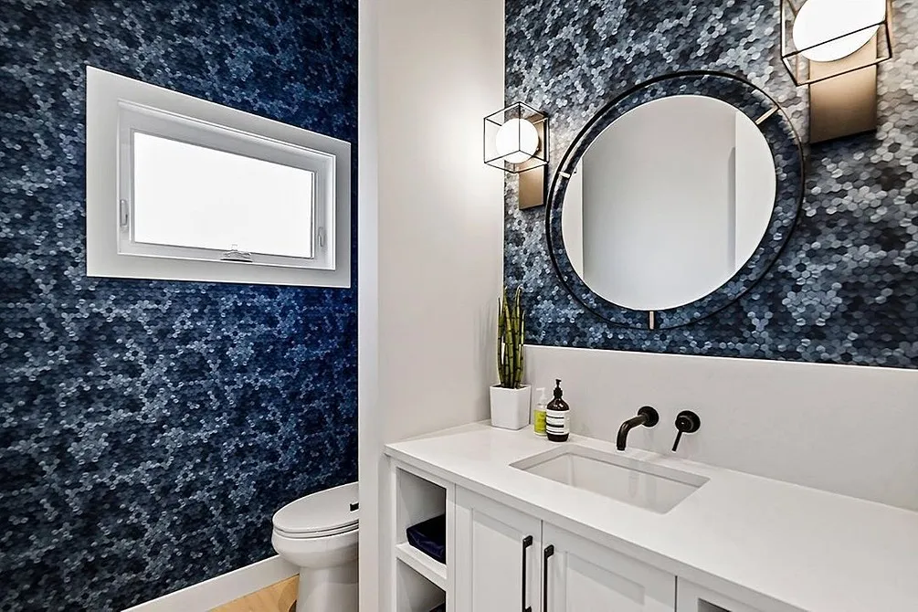 Наиболее подходящий вид мозаики в дизайн маленькой ванной — зеркальная. Она визуально увеличивает пространство. Кажущаяся хрупкость обманчива: на самом деле повредить её довольно сложно. С её помощью оформляют и стены, и отдельные элементы, например, экран ванны.