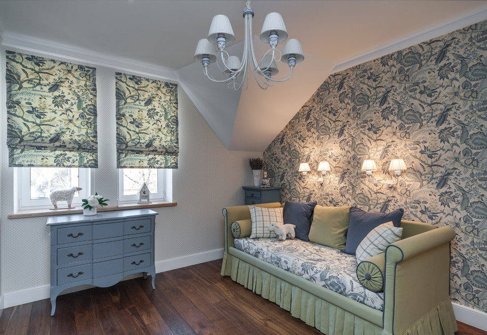Шторы из льняной ткани с цветочным орнаментом в комнате прованского стиля