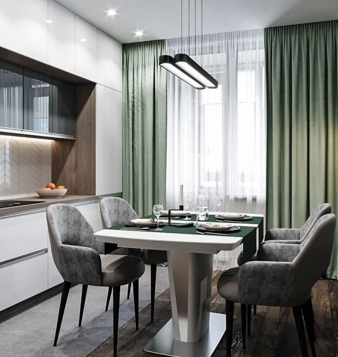 На фото представлен дизайнерский прием, при котором косые углы кухни визуально смягчаются длинными занавесками.