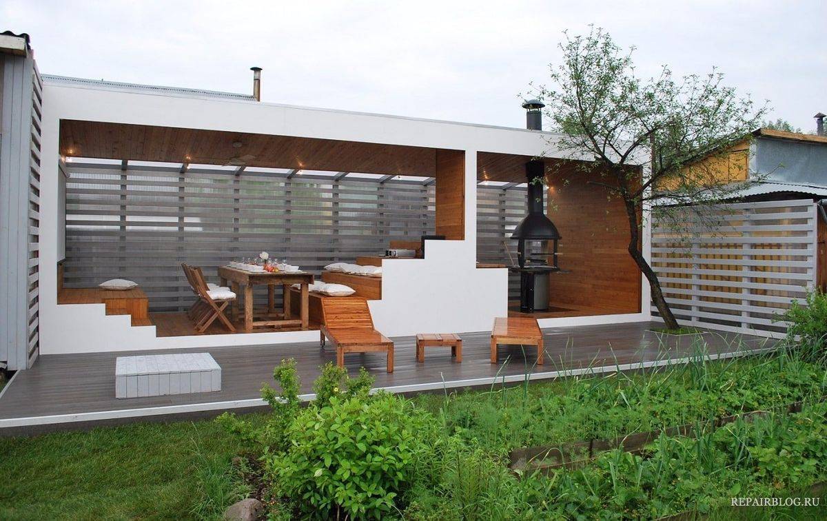Если вы хотите вместить барбекю, мангал, зону приема пищи, зону отдыха и террасу, то беседка может быть: