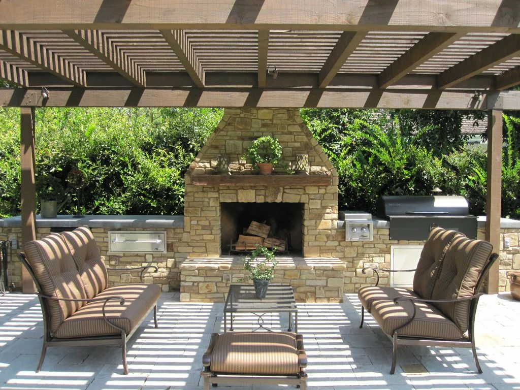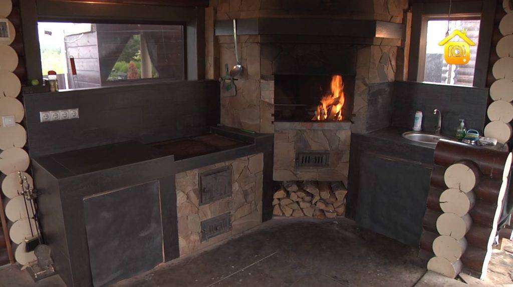 - Каменные варианты обладают преимуществом перед деревом, они менее пожароопасные, иногда огонь оставляют в открытом виде или устанавливают барбекю. Но это качество не исключает соблюдения мер от возгорания.