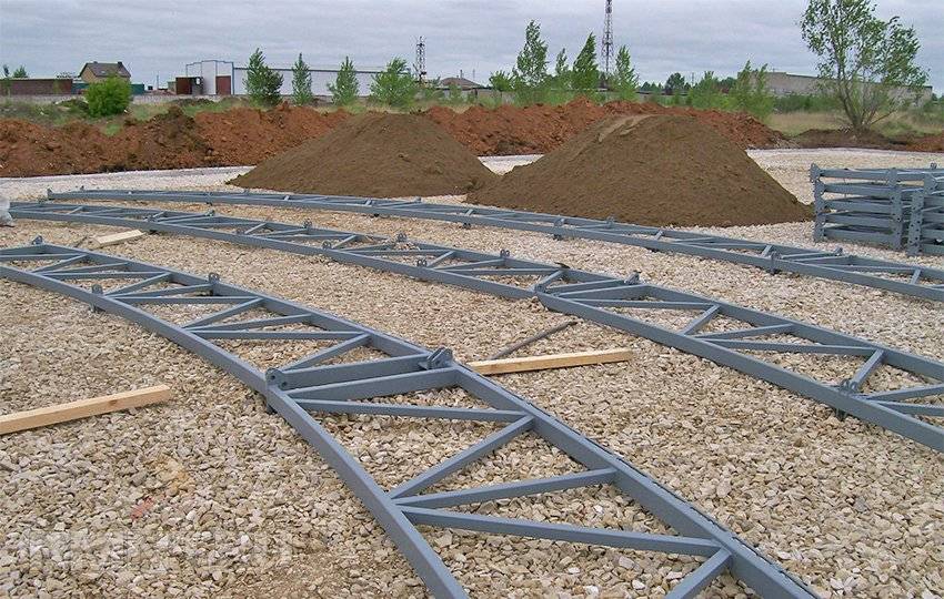 В данном случае ангар монтируется на металлическую раму. Перед установкой рамы необходимо подготовить ровную площадку. Для этого снимается плодородный слой почвы до глиняного пласта. Затем котлован засыпается щебнем и выравнивается по горизонту. Площадку можно забетонировать или покрыть асфальтом. На подготовленной площадке из двутавровой балки или трубы большого диаметра вариться рама в размер ангара с поперечными перемычками для жесткости. Затем к этой раме будут привариваться стойки ангара. Для упрощения монтажа к раме можно приварить металлический уголок в местах установки колонн и просверлить в них отверстие для фиксации болтами стоек при монтаже. Раму можно просто уложить на ровную площадку, но лучше все же установить на винтовые сваи, если есть такая возможность.