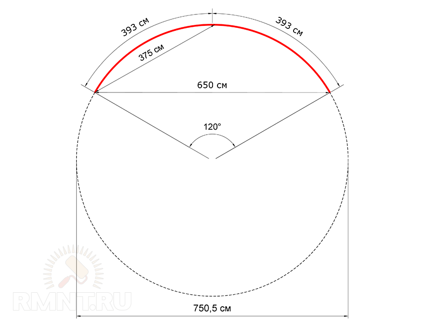 Для примера возьмём арку-треть с основной хордой 6,5 метра. Полный угол окружности — 360°, его треть — 120°, половина от трети — 60°. Разделив основную хорду (6,5 м) на синус этого угла (0,866) получим диаметр целой окружности ~750,5 см и длину полной окружности 23,58 м. Нас интересует треть этой длины — 786 см, то есть при имеющемся погонаже труб в 4 м будет разумно изготовить арку из двух сегментов. Выполнив расчёты снова в обратном порядке, мы выясним, что для каждого сегмента с длиной дуги 393 см (1/6 часть окружности) хорда составит 375 см. Значит, трубу нужно равномерно сгибать в дугу до тех пор, пока расстояние между её краями не станет равным длине хорды.