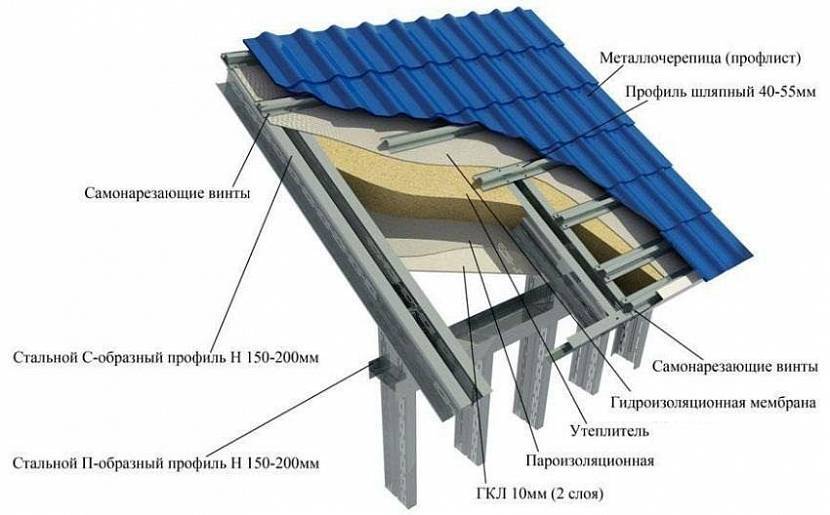 - Сборка конструкций своими руками. Наружная сторона металлокаркаса при этом обшивается профлистом или стекломагниевим листом, между стойками закладывается утеплитель. В качестве теплоизоляции можно использовать минеральную вату или экструдированный пенополистирол. При ограниченности бюджета можно рассмотреть более дешевый вариант — пенопласт. При использовании пенопласта или минеральной ваты потребуется укладка пароизоляции с внутренней стороны и гидроизоляции с наружной. Изнутри обшивку можно сделать гипсокартоном. Наружная отделка закрепляется на профлист.