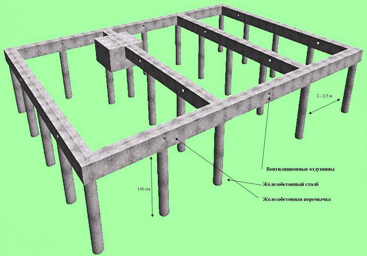 В зависимости от того, каков объемный вес постройки, то есть нагрузка на каждую отдельную опору, а также от высоты столба и типа грунтов, принимается разный шаг опор. Так, поверхностная установка требует шага в 1,5…3 м, при мелкозаглубленных столбах на не просадочных грунтах допустимы 2…4 м, для заглубленных опор – 3…6 м.