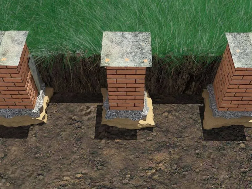 Опору выкладывают до тех пор, пока она не поднимется над поверхностью на высоту в 20 см. Если на участке присутствует небольшой уклон, то все столбы выравнивают по самому верхнему. По окончании кладки, столбу дают неделю выстоятся и делают гидроизоляцию, как в ленточном варианте. Отсыпку свободного пространства вокруг опор выполняют щебнем или шлаком.