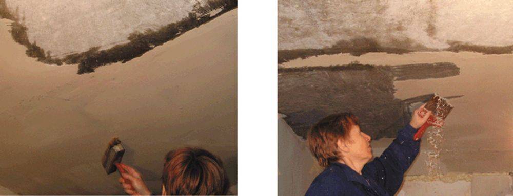 Поскольку потолок не должен иметь остатков старой отделки с местами низкой плотности отслаивающимися частями, другими изъянами, обнаруженные дефекты устраняются. Убираться скребком должны любые материалы вплоть до плитного перекрытия, чтобы при нанесении нового материала эти частички не скалывались, не создавали борозд.