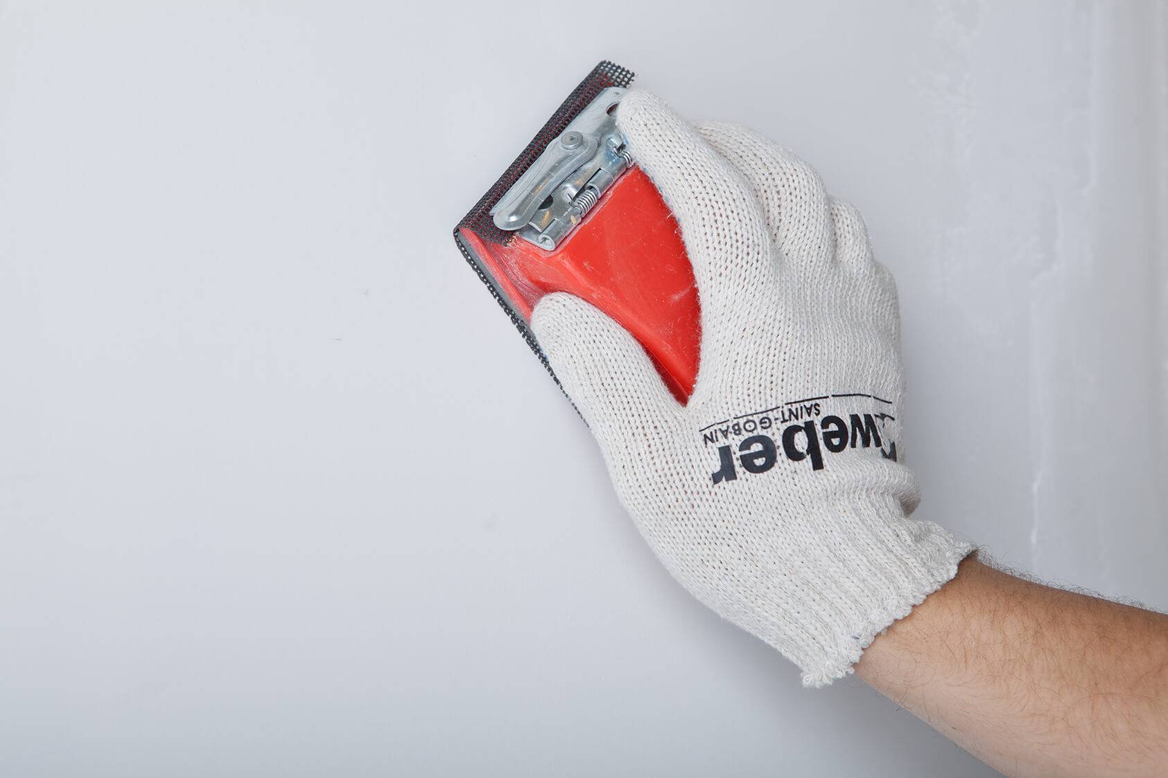 - После высыхания штукатурки, потолок подвергается шлифовке с помощью специальной наждачной бумаги с мелким абразивом. Для удобства использования, расходный элемент наклеивается на специальный пластиковый держатель.