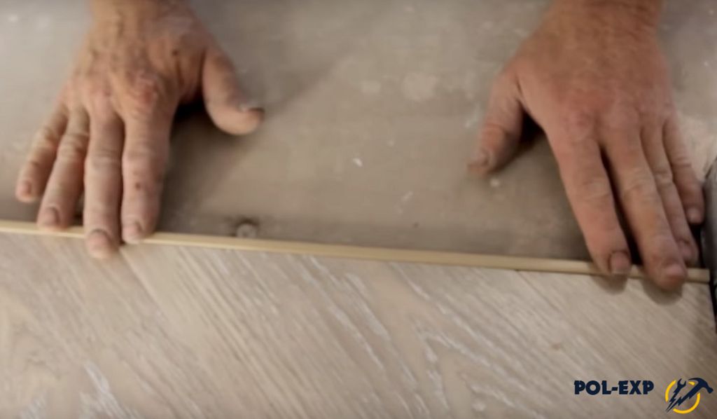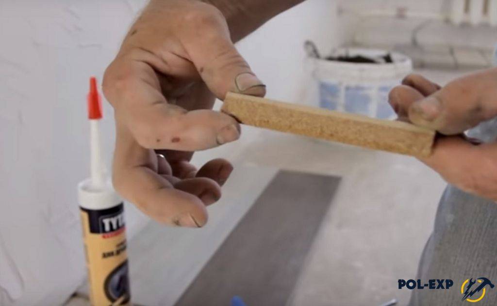 Ламинат на этом этапе уже уложен, нужно приступать к укладке плитки. Но для начала приклеивается к основанию и сам пробковый порожек при помощи надежного строительного клея. Сначала наносится на черновое основание вдоль кромки ламината клей, на который потом укладывается порожек, но временно не прижимается.