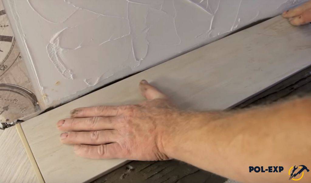Традиционным способом с другой стороны от пробкового компенсатора производится укладка плитки керамической на клей.