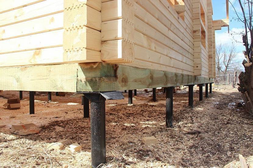 Перед тем, как начать устанавливать сваи, нужно выполнить так называемую обвязку (армирование). Его суть заключается в том, что выкладывается основание (подойдут рельсы), соединяются воедино и на них выкладывается патрубок из дерева (первый венец крепиться именно к обвязке).