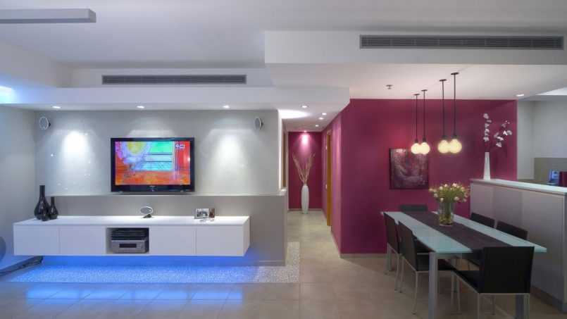 Также можно этому недостатку найти достойное дизайнерское решение, разместив например конструкцию между полотном и базовым потолком, которая при включенной подсветке образует красивый теневой рисунок. Он в сочетании со светящимся полотном станет главным украшением вашей комнаты.