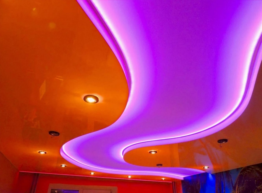 Различные виды подсветки в сочетании с необычными потолочными моделями, являются оригинальным стилистическим приемом.