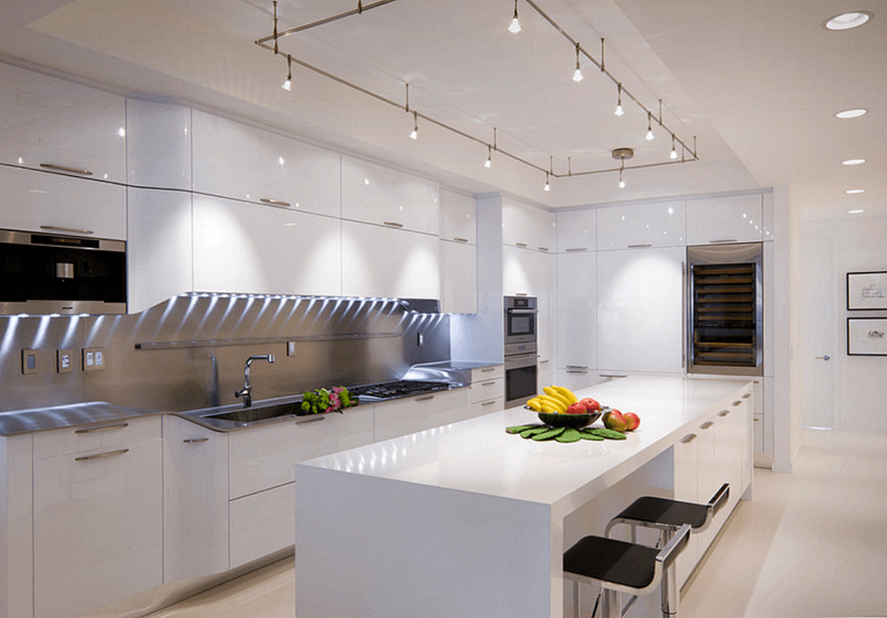 Сложнее все обстоит с кухнями. Желательно использовать холодные цвета подсветки. Лиловое, синеватое свечение на психологическом уровне снижает аппетит и выгодно оттеняет цвета фруктов и овощей.