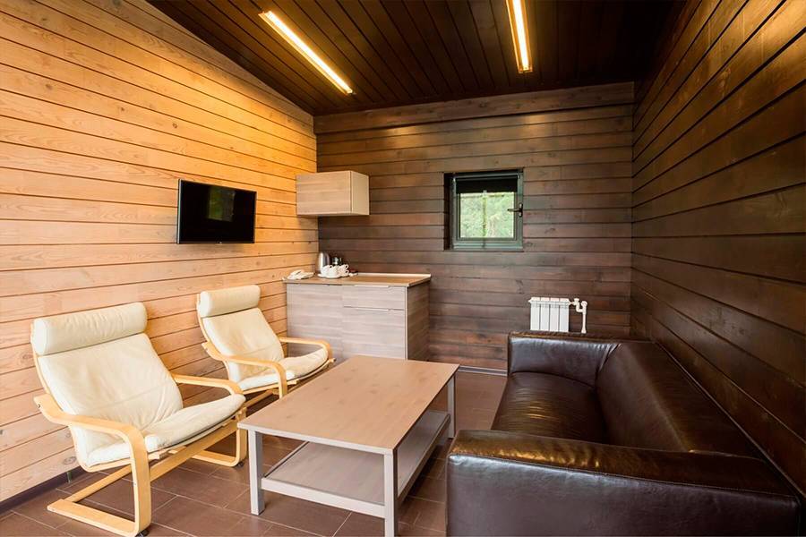 К светильникам в комнате отдыха в бане особых требований нет. В таких помещениях влажность находится в пределах нормы, поэтому приборы могут быть любыми. Если люстра на потолке не дает достаточного освещения, можно дополнительно установить настенные модели с плафонами.