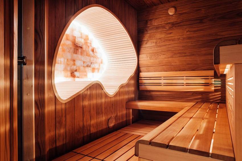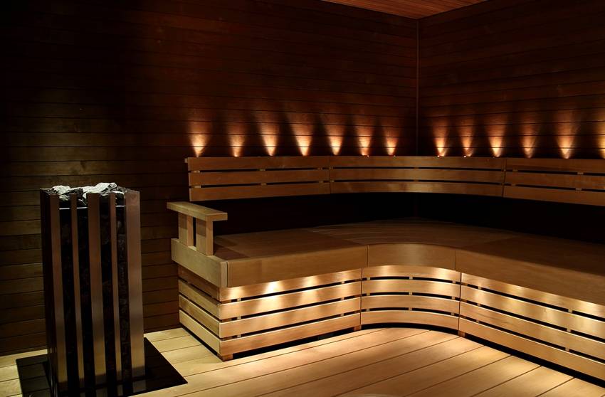 Для оформления просторной сауны отеля Lanerhof (Италия) выбрана скрытая фоновая подсветка, деликатно подчеркивающая фактуру натурального дерева, природного камня и полированного металла