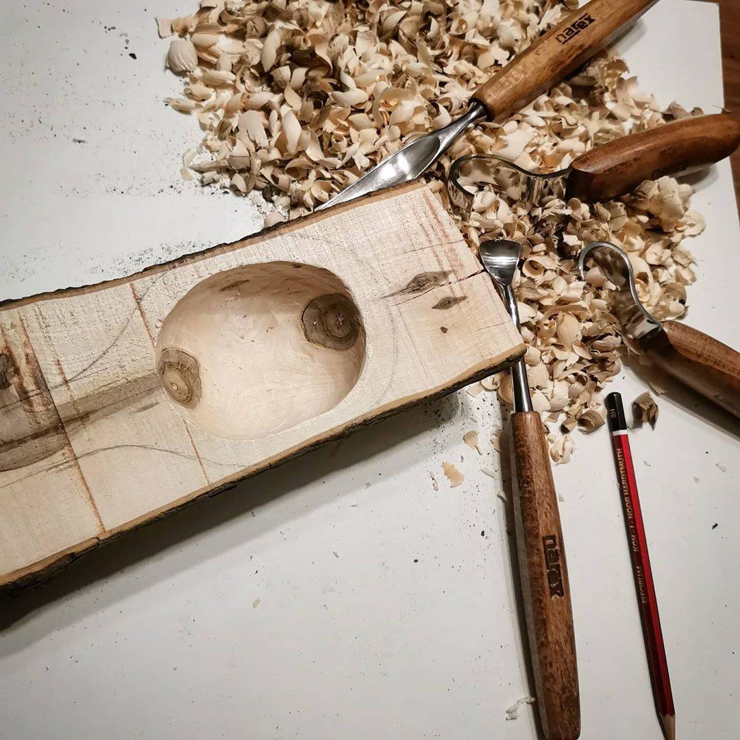 Первоначально на поверхность заготовки из липы переносим контуры дуги