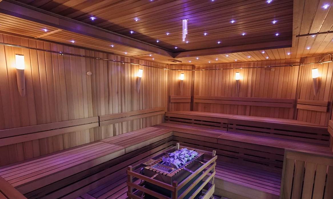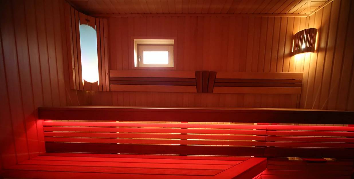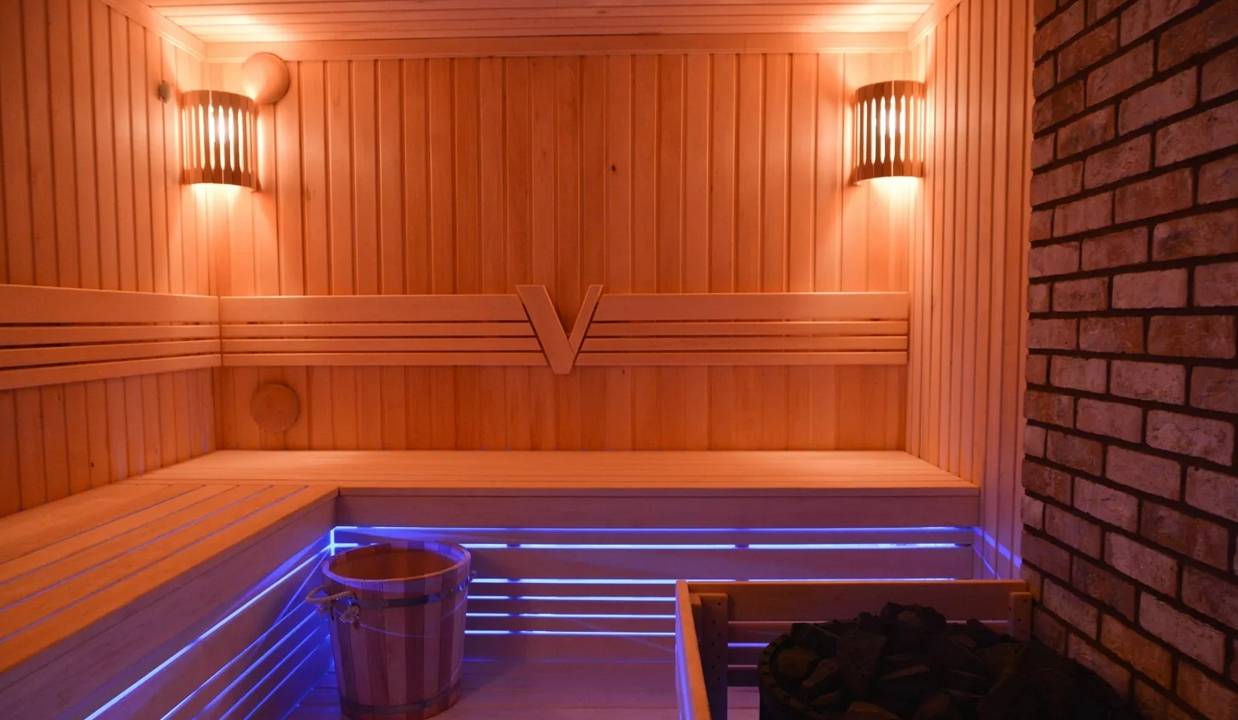 Красивое освещение в сауне с использованием светодиодных лент и подсветки экрана из гималайской соли