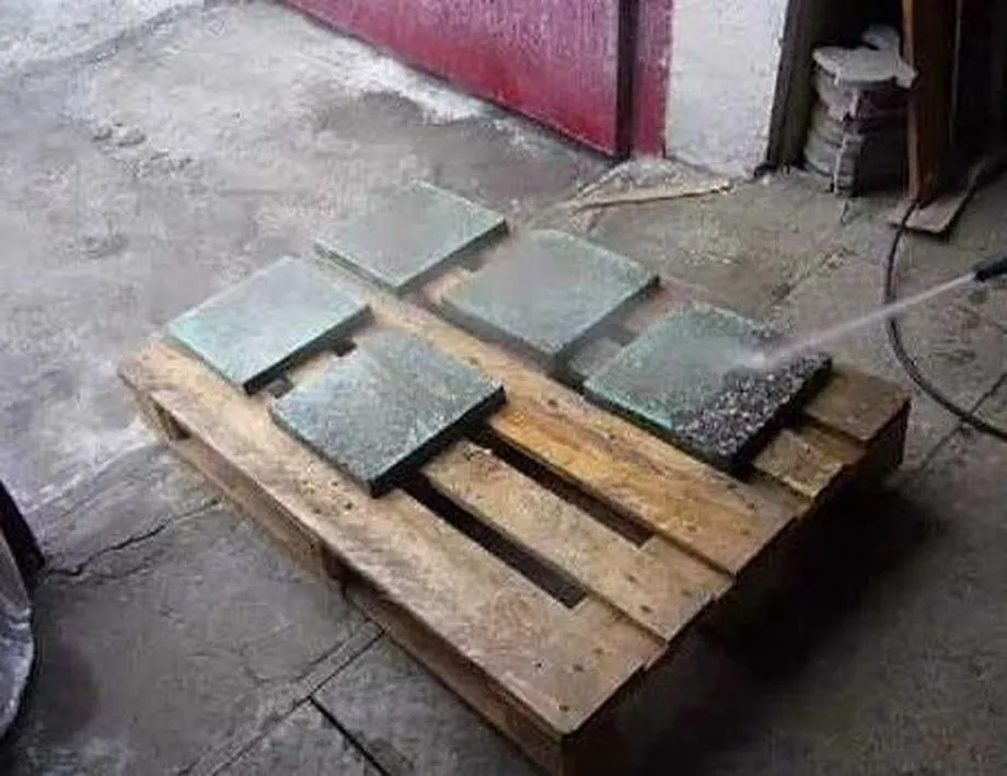 Чтобы мытый бетон получился прочным и красивым, работать нужно очень быстро. Вымывать остатки бетона начинайте сразу же, как только извлекли плитку из формы. Дальнейшей отделки, декорирования мытый бетон не требует – он сам по себе выглядит привлекательно.