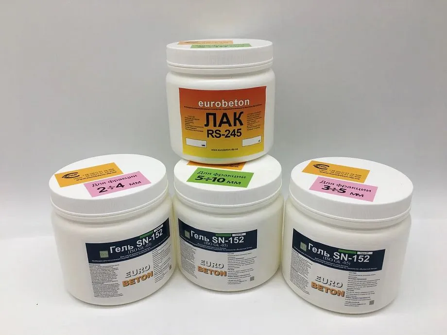 Замедлитель схватывания бетона (Гель для фракции 3-6 мм) — специальный реагент замедляющий скорость созревания бетона в поверхностном слое. За счет разной скорости вызревания смеси в глубине и на поверхности изделия через установленное время (20-24 часа*) основная часть изделия набирает необходимую для расформовки прочность, в то время как гидратация поверхностного слоя не происходит. После расформовки этот поверхностный слой удаляется водой под давлением либо капроновой щеткой, обнажая заполнитель.