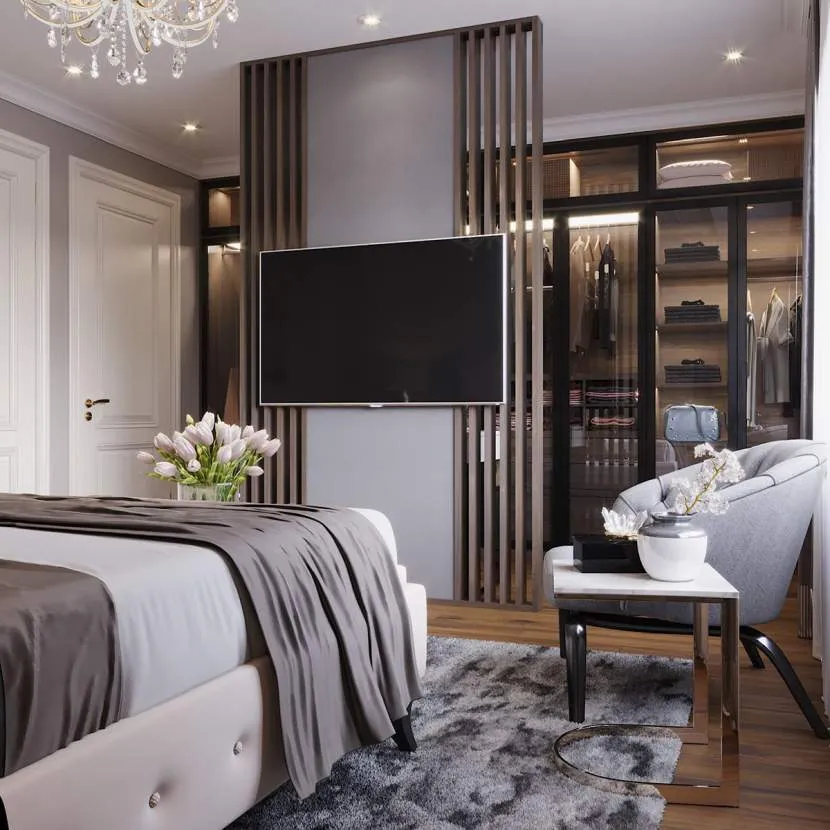 Часто требуется скрыть присутствие телевизора в спальне. Особенно, если речь идет о классическом интерьере, когда присутствие современной техники несколько выбивается из стилевой концепции.