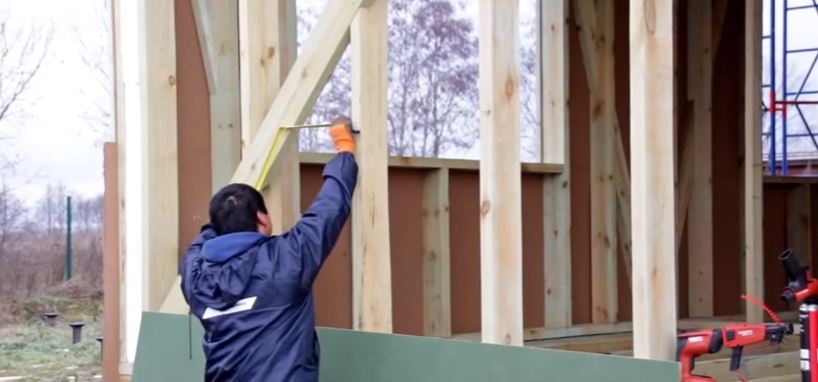 Монтаж панелей ведут от угла дома. Плиту устанавливают так, чтобы ее нижняя кромка располагалась вдоль линии разметки, нанесенной в шаге №1. Длинная сторона панели должна примыкать к угловой стойке каркаса.