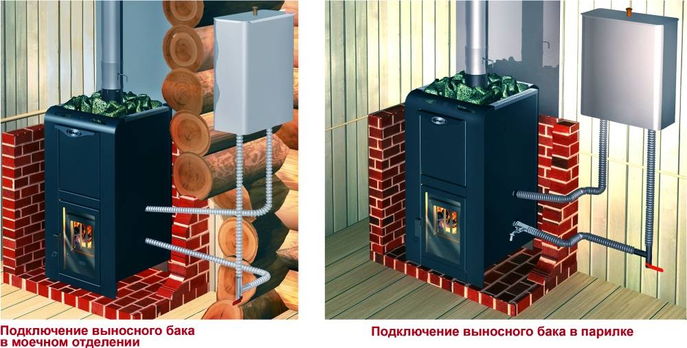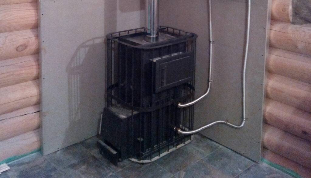Чаще всего теплообменники такого типа устанавливают на банную печь и используют в качестве нагревателя воды для ГВС. Бачок оснащают штуцерами в верхней и нижней его части, к ним подключают трубы, выведенные в систему. Бак для горячей воды при этом устанавливают в душевой или парилке. Возможно использовать такую систему и для отопления подсобного помещения или гаража.