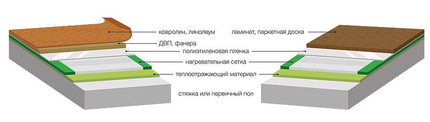 Основной элемент теплого пола – ламинированная нагревательная сетка. Также в конструкцию входит слой полиэтиленовой пленки 100–200 мкм.