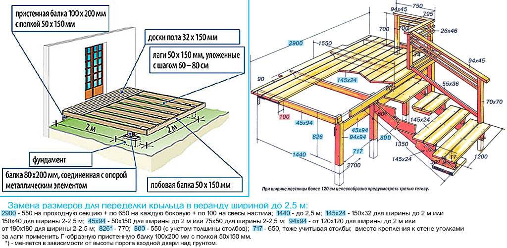 Да, возможно. При соблюдении нескольких условий. Первое – ширина исходной конструкции (крыльца) должна быть не менее 1,2 м. Второе – подпол веранды должен быть холодным, а ее фундамент не препятствовать подземному стоку. И третье – стеклить силикатным стеклом и утеплять веранду нельзя будет. Четвертое – веранда-крыльцо может быть только прямой. В таком случае доработка сведется к изменению размеров исходной конструкции и увеличению типоразмеров пиломатериалов для нее. Как устроена открытая веранда-крыльцо, в чертеже с размерами, показано справа на рис. Устроить над ней крышу не возбраняется.