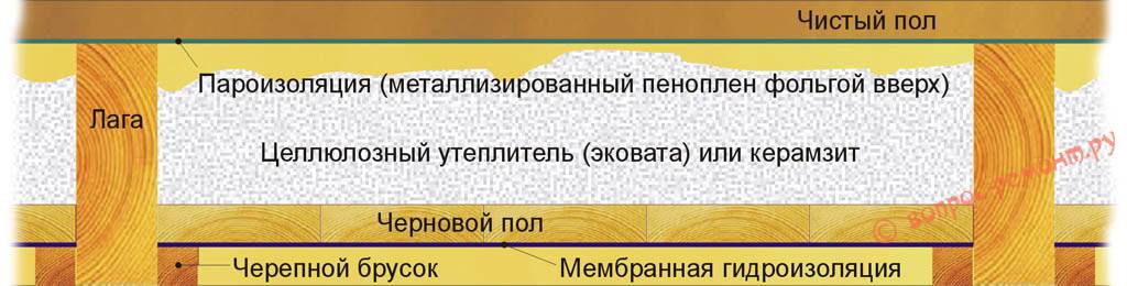 Схема утепления пола веранды дана на рис. В холодном влажном подполе единственно надежный эффективный утеплитель – эковата. Попадание в ее слой точки росы в данной схеме неизбежно, но эковата сохраняет свои качества и увлажненной. Вариант с керамзитом – для сезонно проветриваемого подпола в холодных местах, см. выше. В данном случае он действует скорее как стабилизатор теплового потока, чем как «настоящий» утеплитель.
