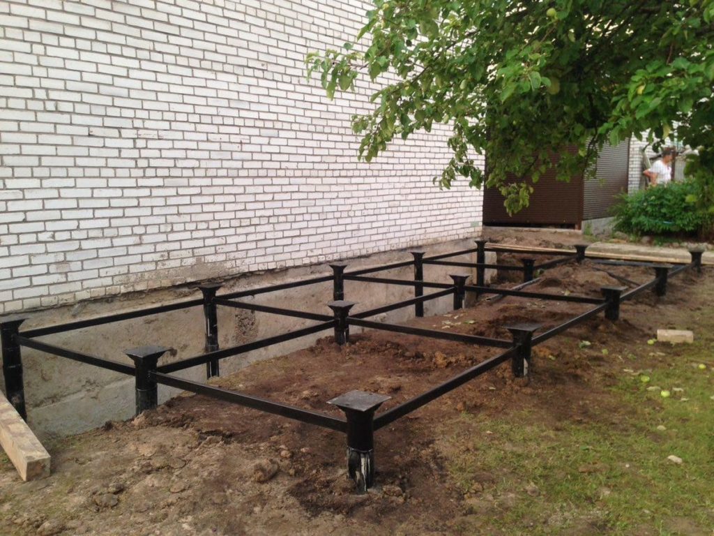 Фундамент внешне выглядит как ряд столбиков по всей площади пристройки. Вокруг столбов, которые расположены по периметру, делается обвязка, а на внутренние опоры крепятся лаги.