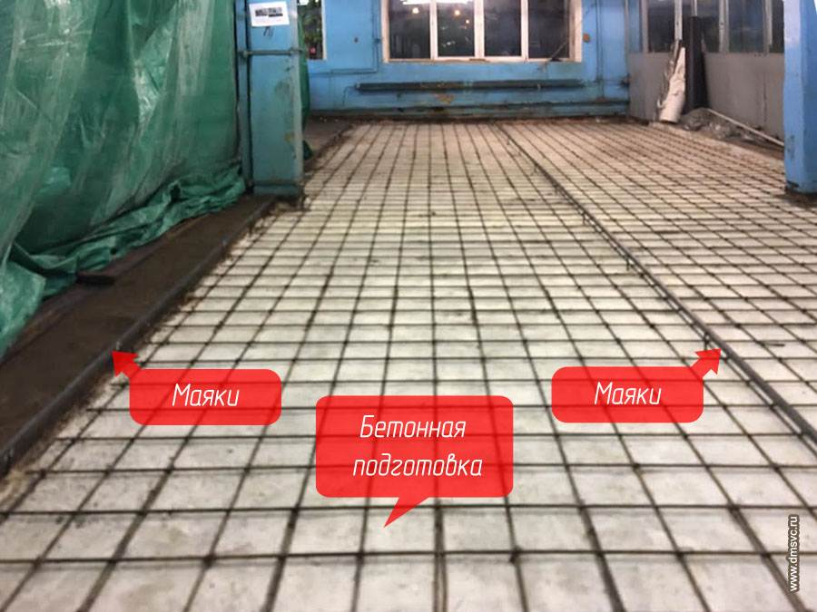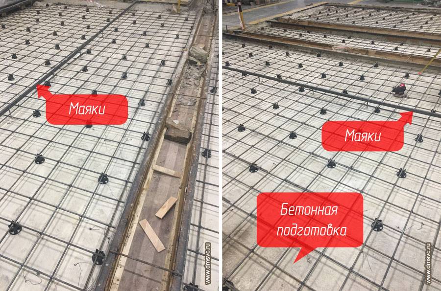 Ниже на фото можно увидеть устройство маяков и армирующей сетки на специальных пластиковых опорах на слое тощего бетона (бетонной подготовки).