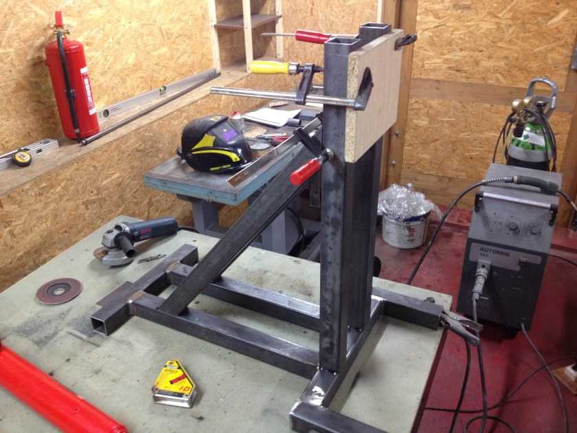Шаг первый. Изготовьте металлический каркас. Внизу можете дополнительно приварить крепежи для фиксации на столешнице. После этого разместите пару вертикальных опор: сбоку и по центру. С противоположной стороны (там, где опора отсутствует) профиль будет приподниматься, а потому ее требуется прикрепить болтами. Данная часть будет приподниматься с помощью домкрата.