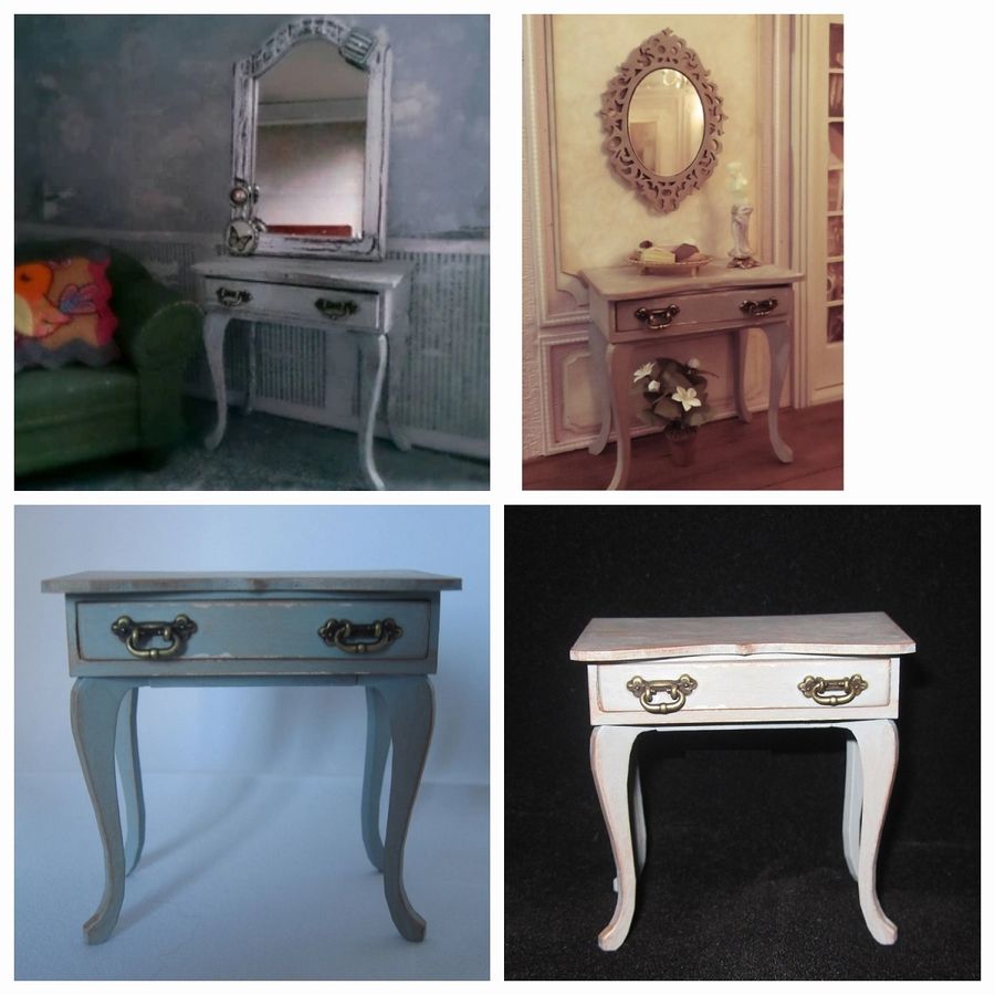 Этот столик не выглядит, как собственно туалетный, это просто винтажный кукольный столик, напоминающий комод из картона. Но можно выложить на нем уходовые средства, разложить по ящикам аксессуары – и получится классический туалетный столик.