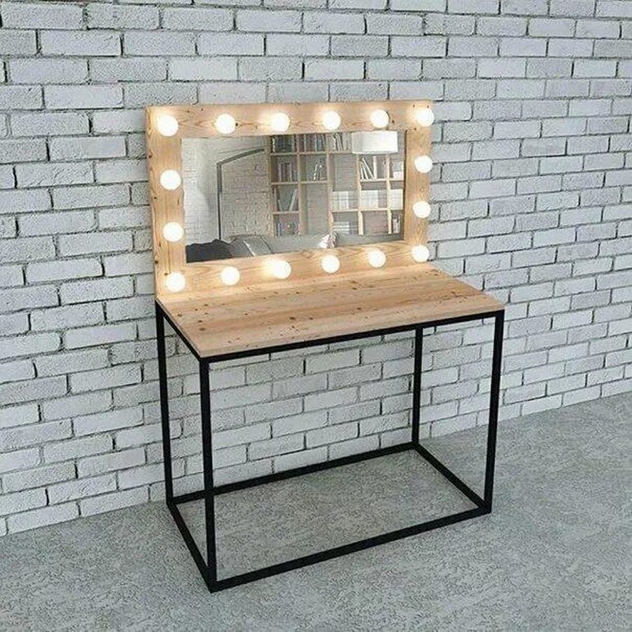 Туалетный столик с металлическим каркасом. Столик изготовлен из ЛДСП. Имеется зеркало прямоугольной формы. с трех сторон расположены лампы. К столику присоединен провод для питания ламп.