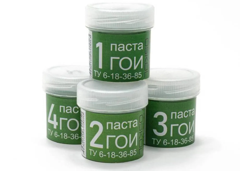 Паста ГОИ, получившая свое название по имени института-разработчика (Государственный Оптический Институт), бывает четырех видов и различается по номерам, цвету, размерам абразивных частиц и, соответственно, по степени воздействия на поверхность.