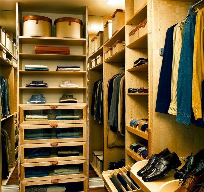 Выдвижные ящики и полочки удобней поместить с одной стороны гардеробной комнаты, а штанги для вещей – с другой.
