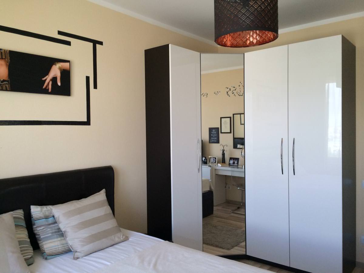 Такой вариант идеален для просторной спальни, когда можно полностью открыть двери, что позволит хорошо рассмотреть содержимое шкафа.