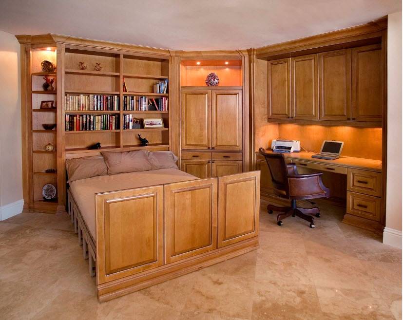Для косметики, украшений и аксессуаров подойдут маленькие ящики. Возле них уместно будет откидное или выдвижное зеркало либо даже небольшая откидная полка-стол. Кстати, запасные подушки и одеяла займут гораздо меньше места, если упаковать их в вакуумные пакеты и откачать воздух.