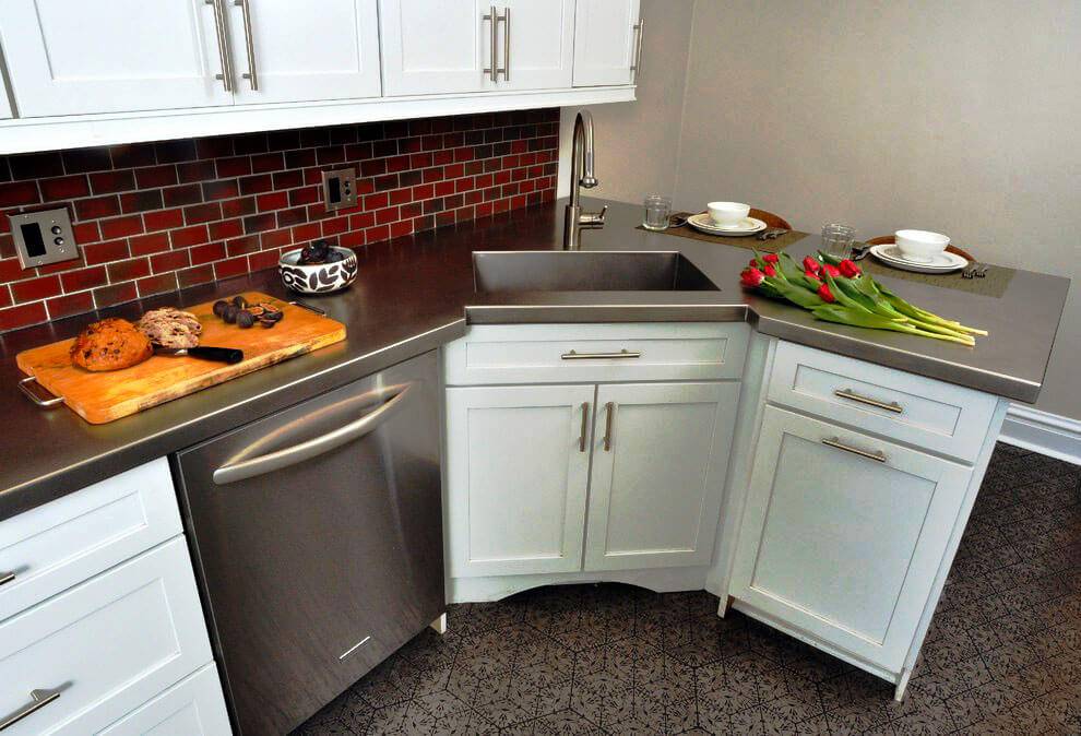 Для угловых кухонь существует специальные мойки. Они очень эргономичны, красивы и выглядят стильно. Мойка в углу – очень удобное решение, а если оформить над ней стильную сушку, будет вообще замечательно.